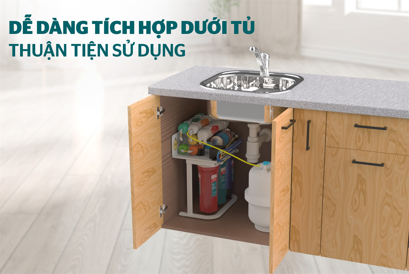 Với thiết kế không vỏ, sản phẩm dễ dàng tích hợp trong tủ bên dưới bồn rửa tại nhà bếp, giúp hoạt động lấy nước dễ dàng và tiện lợi hơn, đồng thời, tiết kiệm đáng kể chi phí và diện tích cho gia đình.