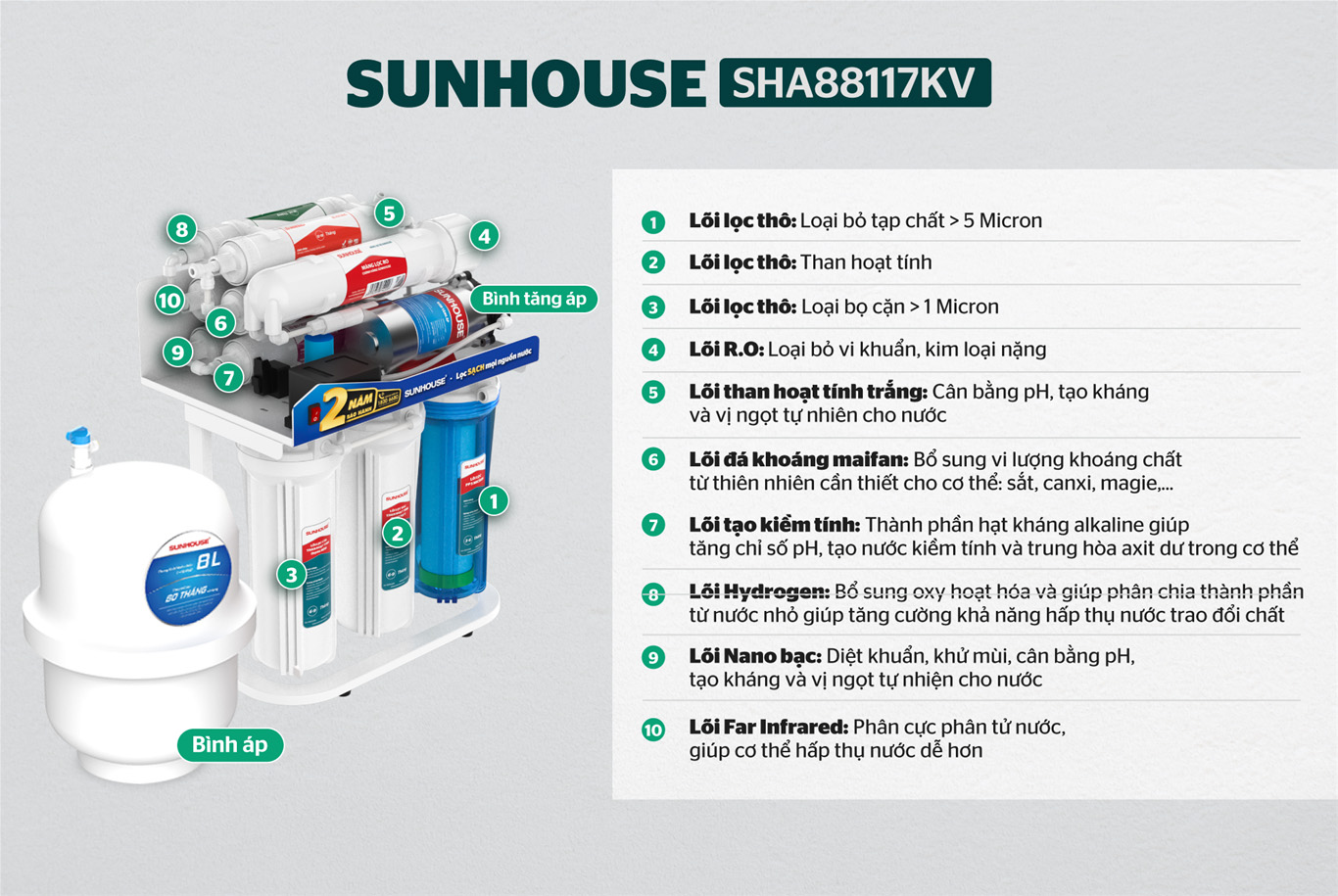 Máy lọc nước SHA8878KV sở hữu bộ lọc 8 lõi, không chỉ lọc sạch nước mà còn bổ sung các khoáng chất hữu ích cho cơ thể. Sản phẩm gồm 3 cấp lọc chính bao gồm lọc thô, lọc tinh và bù khoáng.