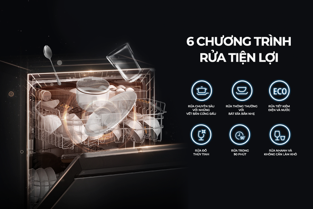 - 6 chương trình rửa linh hoạt, gồm chương trình rửa tiết kiệm ECO