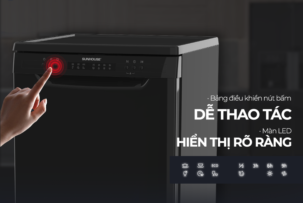 Với tính năng hẹn giờ trễ từ 3h – 6h – 9h, máy rửa bát Sunhouse SHB8014SMB giúp tiết kiệm hơn khi được thiết lập để hoạt động vào ban đêm, khi điện áp nguồn ổn định.