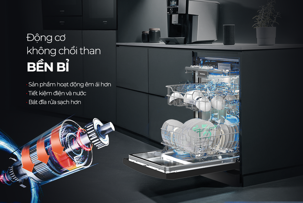 Sản phẩm máy rửa bát Sunhouse SHB8014SMB sử dụng động cơ không chổi than bền bỉ. Đây là loại động cơ cơ hoạt động dựa vào từ trường vĩnh cửu và không sử dụng chổi than (bàn chải). Với động cơ không chổi than, máy rửa bát vận hành êm ái hơn, tiết kiệm điện, nước và quan trọng là chén bát được rửa sạch sẽ hơn.
