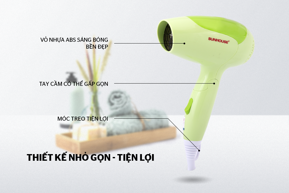 Thiết kế tay cầm chắc chắn, có thể gập lại nhỏ gọn tiện dụng để mang đi xa. Nếu để cố định, bạn có thể treo máy sấy lên tường gọn gàng nhờ móc treo ở chuôi tay cầm.