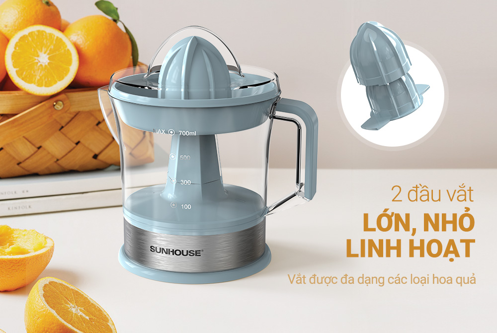 Máy vắt cam SUNHOUSE SHD5511 có thiết kế 2 đầu vắt kích thước khác nhau, phù hợp với hầu hết các loại quả có múi, mang lại sự linh hoạt và tiện lợi cho người tiêu dùng. Đầu vắt lớn phù hợp để vắt cam, trong khi đầu vắt nhỏ giúp vắt chanh, quýt dễ dàng.