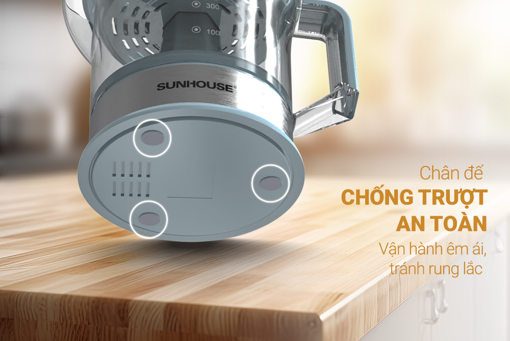 Chân đế của máy được thiết kế chống trượt, giúp máy vận hành êm ái, tránh rung lắc và giảm tiếng ồn đáng kể khi hoạt động. Thiết kế mang lại sự an toàn và tiện lợi cho người sử dụng, đặc biệt là khi bạn muốn vắt một lượng lớn trái cây.