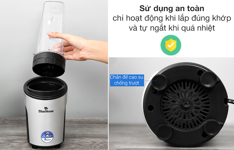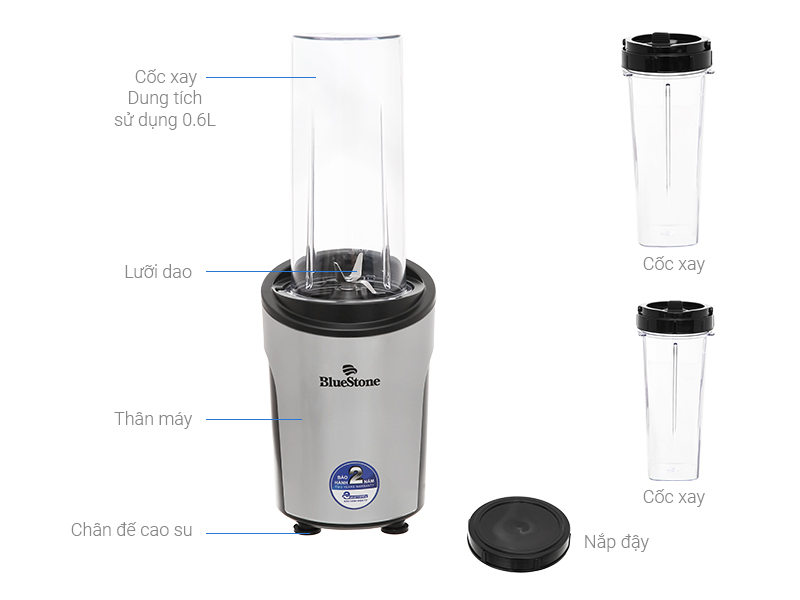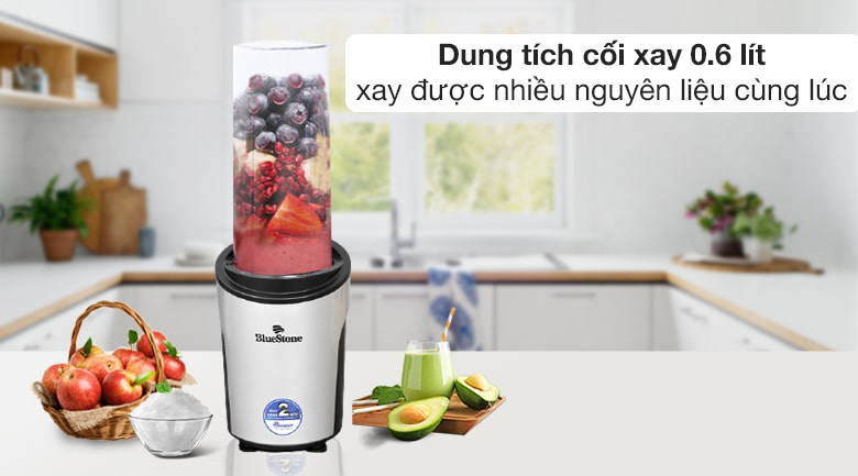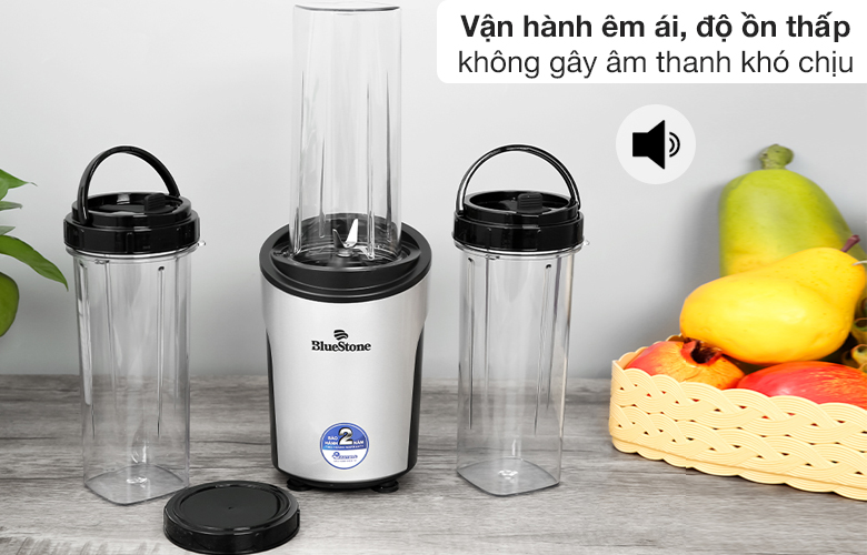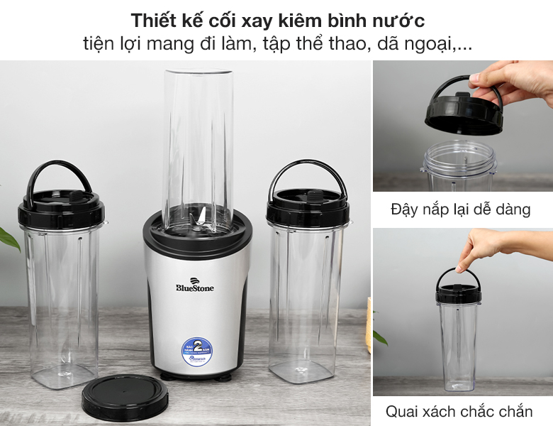 Máy xay sinh tố BlueStone có 3 cối xay kiêm bình nước được thiết kế nhỏ gọn, màu sắc trang nhã, đáp ứng nhu cầu xay sinh tố mang đi làm, tập thể thao, dã ngoại,...