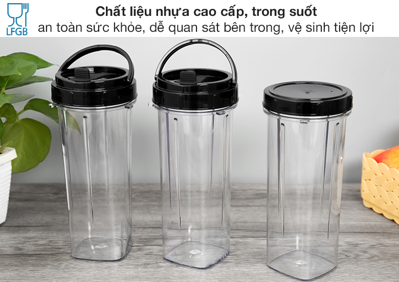 Chất liệu cối xay bằng nhựa cao cấp đạt chứng nhận LFGB, an toàn sức khỏe, trong suốt dễ quan sát bên trong, dễ vệ sinh