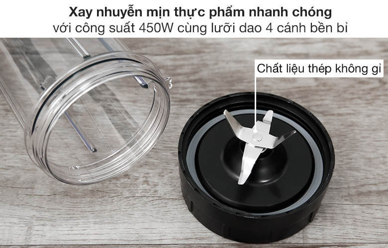 Máy xay sinh tố hoạt động mạnh mẽ với công suất 450W và 1 tốc độ xay, có lưỡi dao 4 cánh bằng thép không gỉ