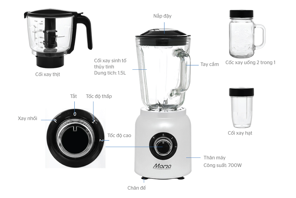 Chức năng: Xay hoa quả, sinh tố + Xay thực phẩm khô + Xay thịt, cá