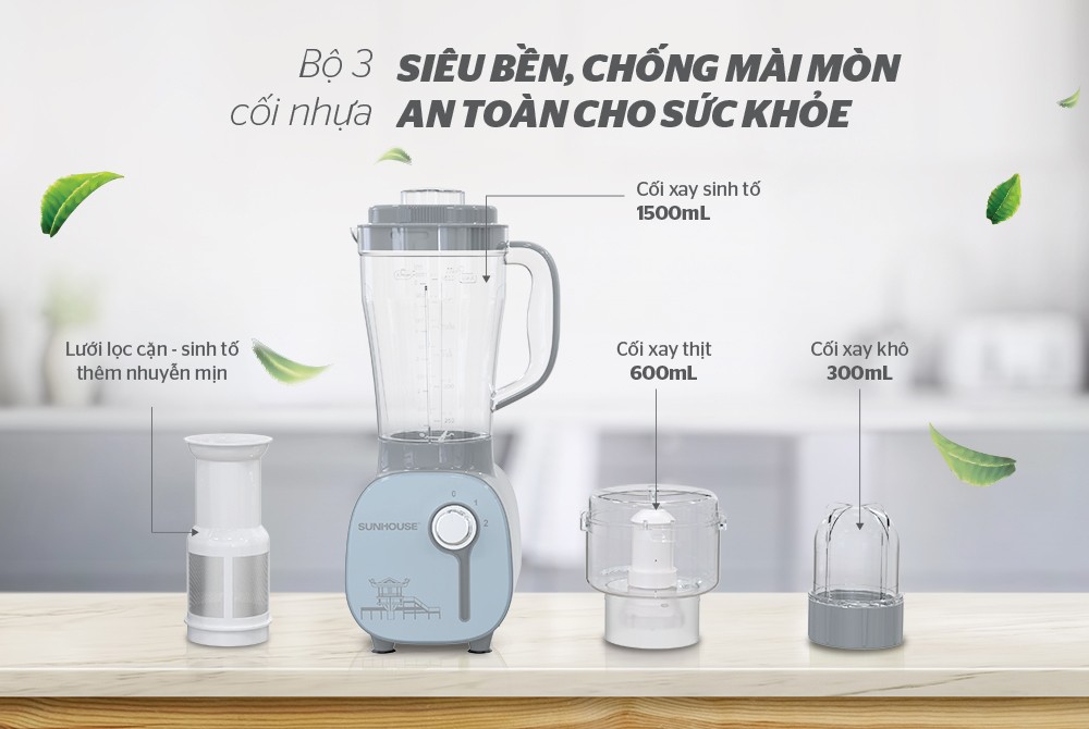 SUNHOUSE SHD5312B được trang bị bộ 3 cối xay sinh tố bằng chất liệu nhựa siêu bền, hạn chế trầy xước, không bị mài mòn, đặc biệt an toàn cho sức khỏe.