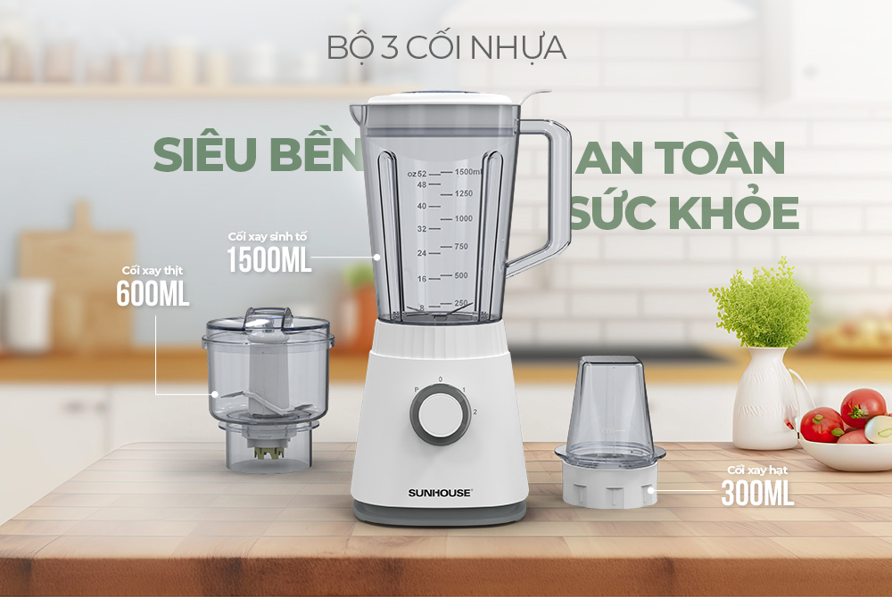 Máy xay sinh tố đa năng SUNHOUSE SHD5316 được trang bị bộ 3 cối xay sinh tố bằng chất liệu nhựa siêu bền, hạn chế trầy xước, không bị mài mòn, đặc biệt an toàn cho sức khỏe.