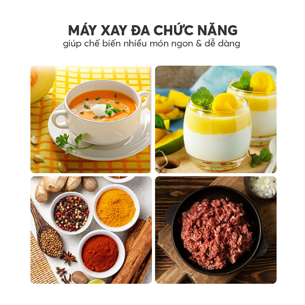 - Thiết kế máy xay đa chức năng như xay sinh tố, xay đá, xay thịt, xay các loại hạt kho để tạo ra các loại đồ uống và thực phẩm khác nhau.