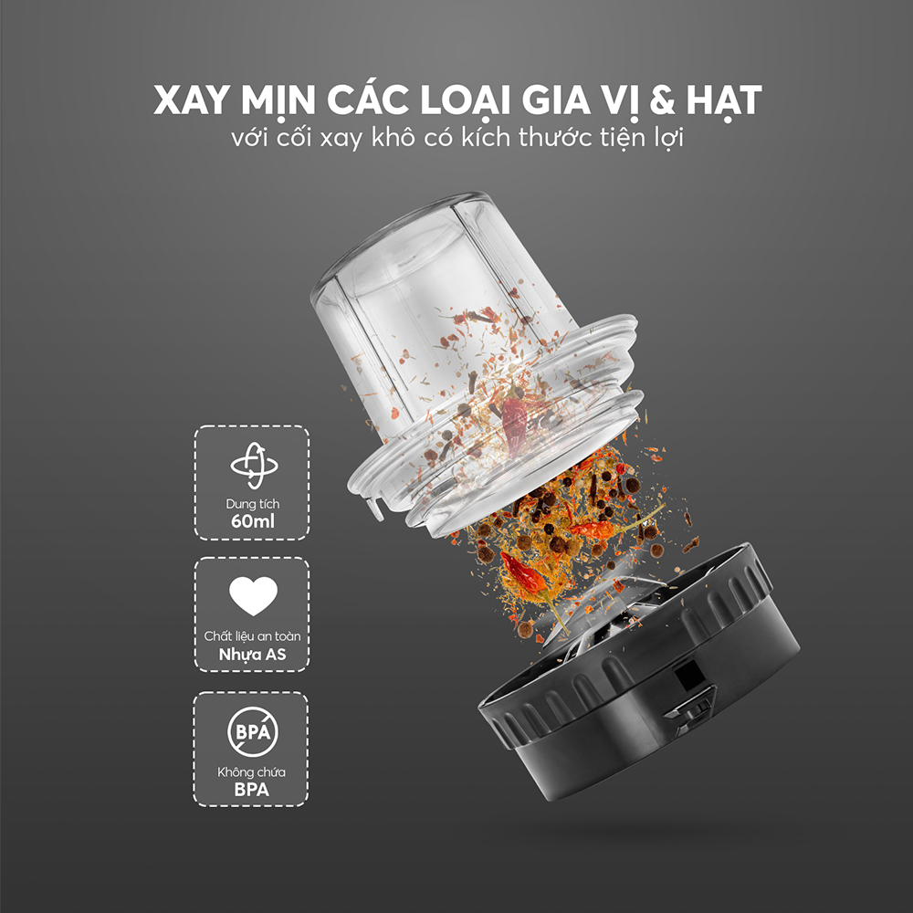 Cối xay khô dung tích 60mL, xay được hầu hết các thực phẩm hạt khô.