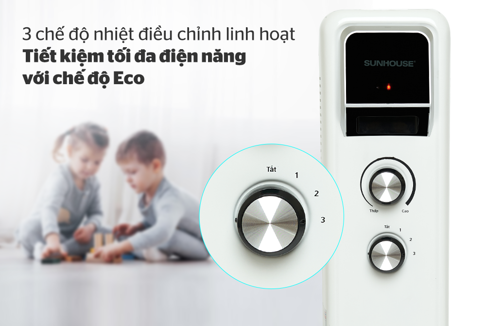 - Tính năng Eco tiết kiệm điện, tiết kiệm chi phí sử dụng cho gia đình ở Máy sưởi dầu SUNHOUSE 13 lá SHD7084 (có giá phơi):