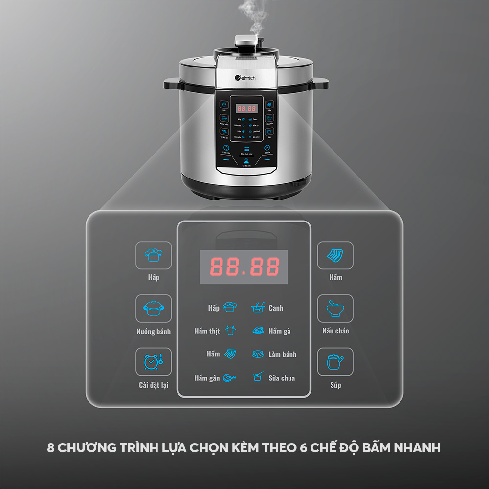 - 8 chương trình nấu đa dạng: Chọn chế độ nấu phù hợp với món ăn chỉ với một nút bấm, từ hấp, hầm, ninh thịt, làm bánh đến nấu cháo, làm sữa chua.