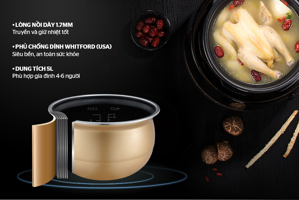 Chế độ/Chức năng: Đa chức năng nấu nướng: hầm gân, súp, cháo, gà, canh, nấu cơm, giữ ấm thực phẩm…