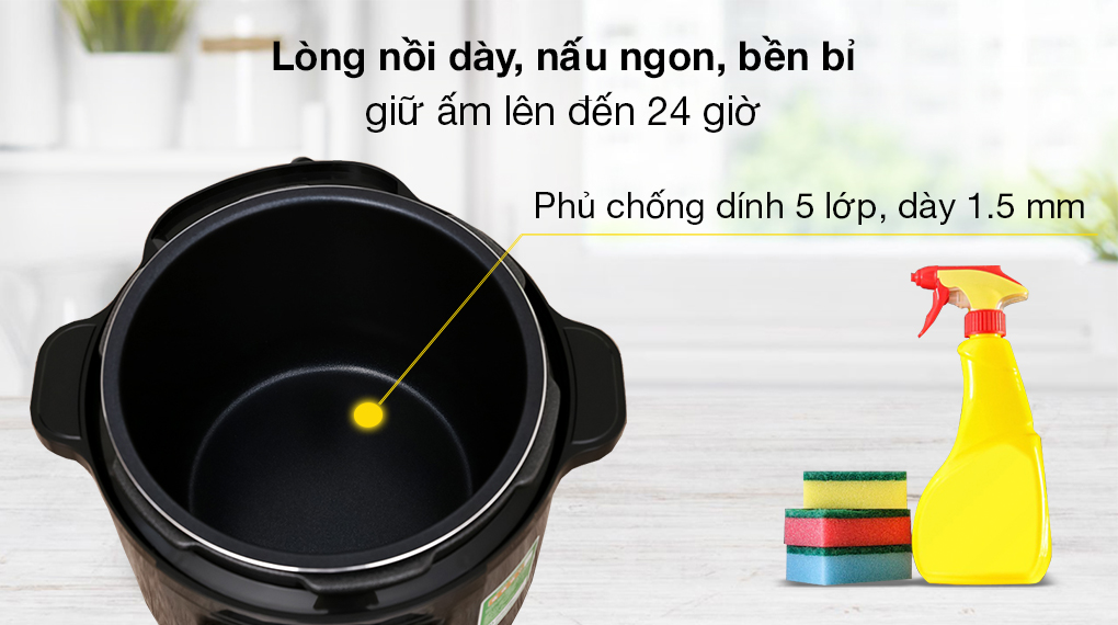 Lòng nồi chống dính 5 lớp bền bỉ, dày 1.5 mm nấu ăn ngon, chống móp méo tốt, dễ làm sạch