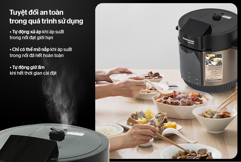 Nồi áp suất điện đa năng SUNHOUSE MAMA SHD1588B được trang bị những tính năng an toàn: tự động xả áp khi áp suất trong nồi quá cao, khóa chặt nắp khi trong nồi vẫn còn nhiều áp suất, tự động ngắt khi nhiệt độ quá cao để đảm bảo độ bền cho sản phẩm và an toàn cho người sử dụng… (đọc kỹ HDSD).
