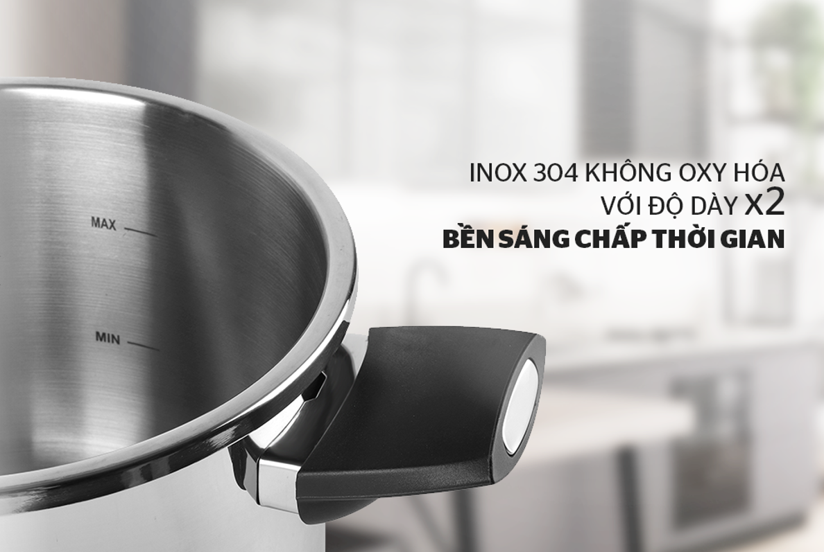 Chất liệu inox không oxy hóa với độ dày gấp 2 lần giúp hạn chế móp méo khi va đập, dễ dàng vệ sinh sau khi nấu và an toàn khi đun nấu với áp suất cao đồng thời duy trì sự sáng bóng khi sử dụng trong thời gian lâu dài.