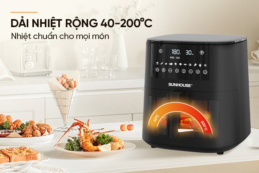 Nồi Chiên Không Dầu 8L Sunhouse SHD4081 với dải nhiệt từ 40-200°C đáp ứng mọi tiêu chuẩn nấu nướng đối với đa dạng thực phẩm. Công nghệ kiểm soát nhiệt thông minh giúp duy trì nhiệt độ ổn định, đảm bảo thức ăn chín đều, giữ trọn dưỡng chất và hương vị.