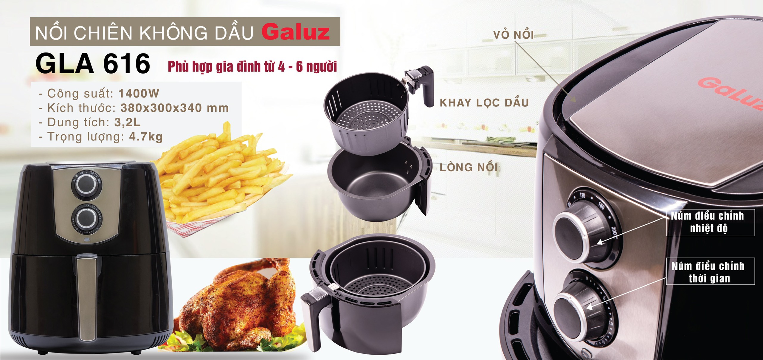Hướng dẫn sử dụng Nồi Chiên Không Dầu Galuz 5.2L (cơ):