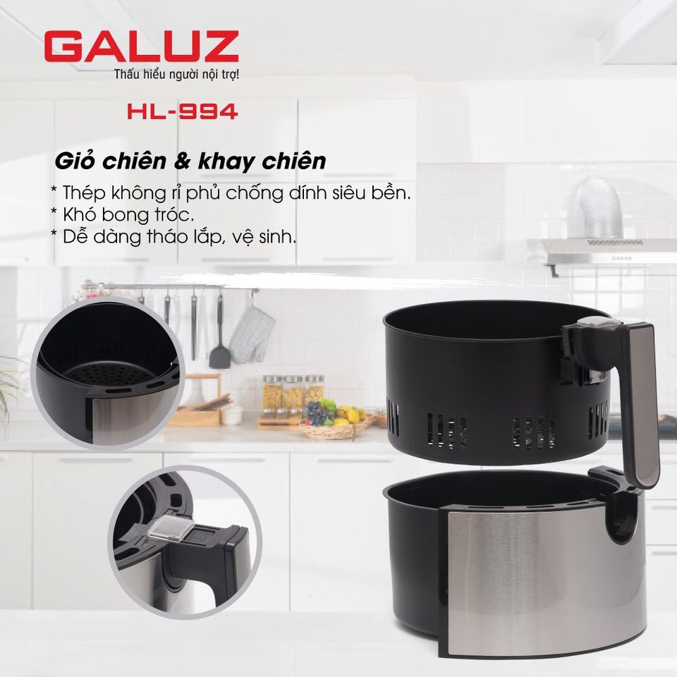 - Nồi chiên không dầu Galuz HL-994 phù hợp với mọi gia đình Việt bởi giá cả phải chăng, chất liệu an toàn, giúp mâm cơm Việt luôn đa dạng các món thức ăn từ chiên, nướng, làm bánh đến các món phụ, tráng miệng. Đồng thời, giảm đến 8% lượng mỡ thừa có trong thức ăn, tốt cho sức khỏe, đặc biệt là những người có vấn đề về tim mạch.