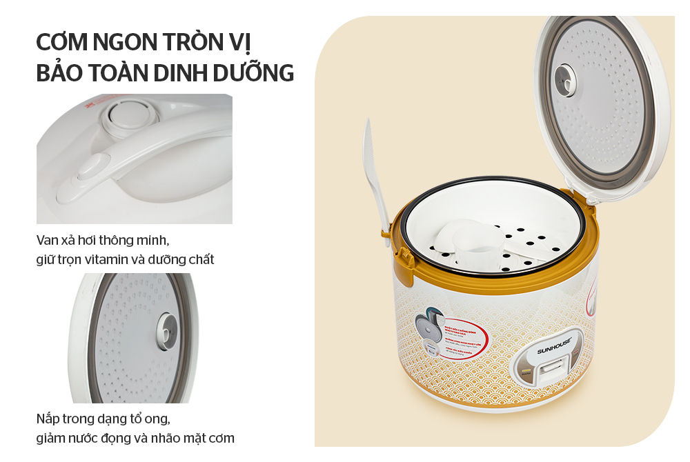 Sản phẩm có van thoát hơi thông minh, tận dụng tối đa hơi nước để làm chín mềm cơm và bảo toàn được tối đa dưỡng chất. Ngoài ra, thiết kế nắp trong dạng tổ ong ngăn hơi nước ngưng đọng trên nắp nhỏ xuống làm cơm nhão và dễ thiu, giúp cơm ráo mặt, thơm ngon hơn.