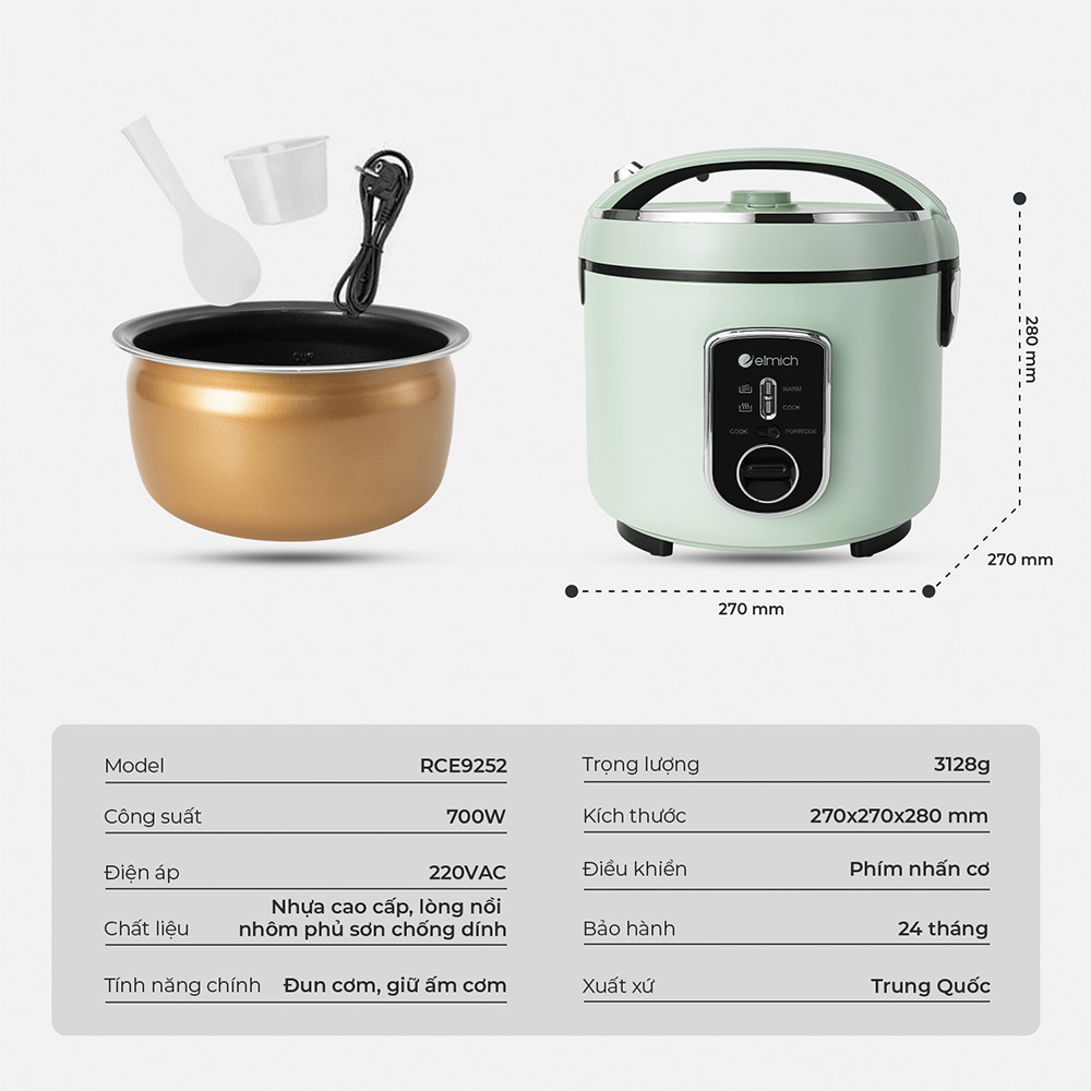 Nếu bạn đang tìm kiếm một nồi cơm điện dễ sử dụng, nấu cơm ngon, giữ nhiệt lâu và có chế độ nấu cháo riêng biệt, thì Elmich RCE 9252 chính là sự lựa chọn tối ưu. Với chất lượng tiêu chuẩn châu Âu, sản phẩm không chỉ giúp bạn chuẩn bị bữa cơm hoàn hảo mỗi ngày mà còn đảm bảo độ bền cao, an toàn khi sử dụng.