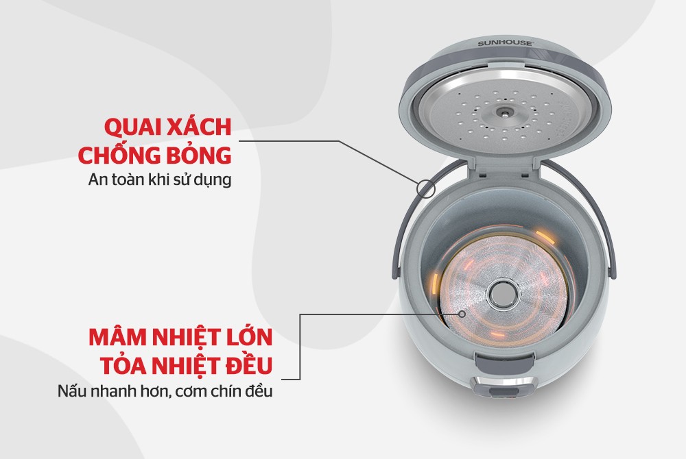 - Đường kính mâm nhiệt lớn, tỏa nhiệt đều, cơm chín ngon hơn