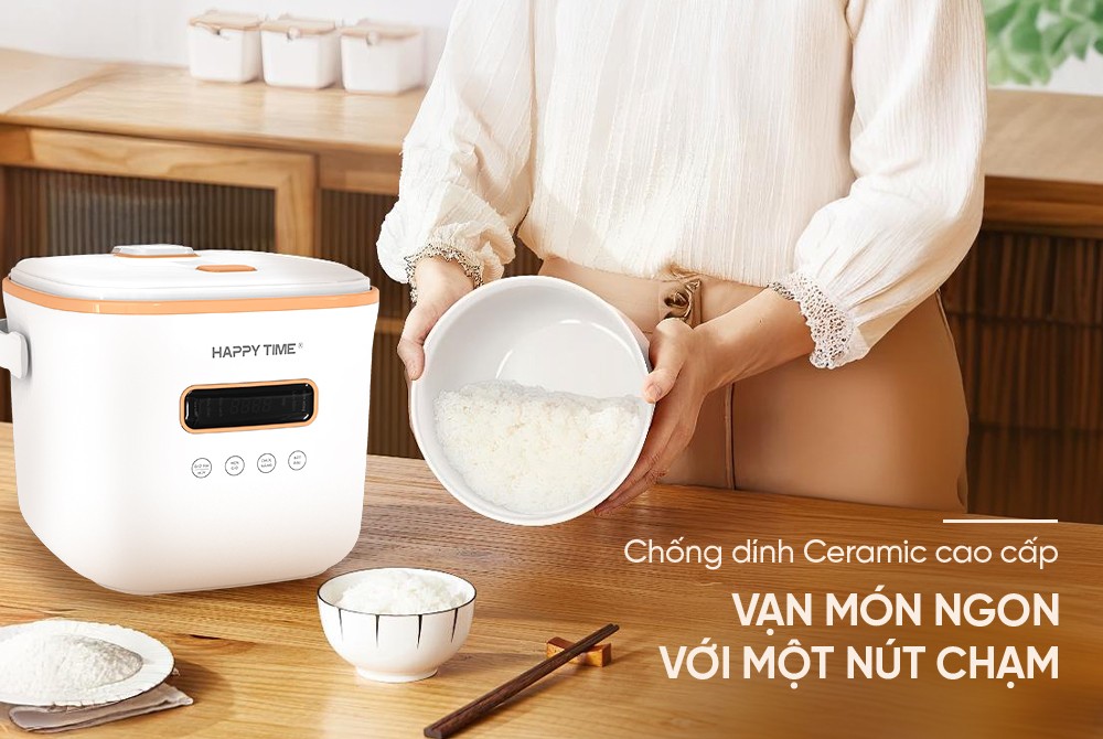 Không gian bếp gọn gàng, tiện nghi hơn với nồi cơm điện tử 1.2L Happytime HTD8810 "nhỏ mà có võ" tích hợp 6 chế độ nấu hiện đại: Nấu cơm, Nấu cháo, Nấu canh, Hấp, Làm bánh và Hâm nóng. Tất cả được tinh gọn trong một màn hình cảm ứng thông minh, giúp bạn chuẩn bị món ăn yêu thích chỉ trong tích tắc mà vẫn tiết kiệm thời gian.