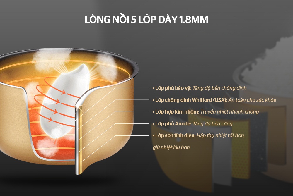 - Lòng nồi 5 lớp dày 1.8mm, phủ chống dính Whtiford (USA) an toàn sức khỏe