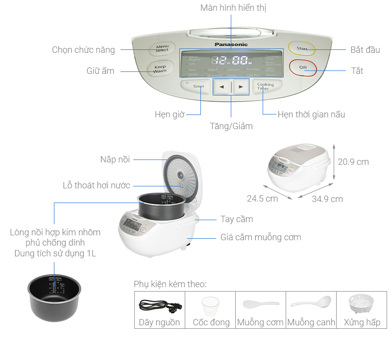 Phụ kiện đi kèm: Muỗng cơm, cốc đong gạo, xửng hấp.