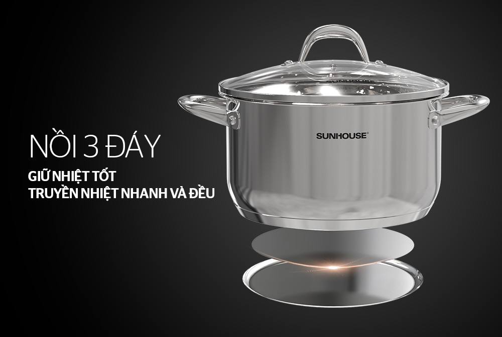 Nồi SHG301-24 của SUNHOUSE, loại nồi inox 3 đáy, sở hữu đáy 3 lớp dày, cho khả năng truyền nhiệt nhanh chóng và phân tán nhiệt đều, giúp tiết kiệm được thời gian và nhiên liệu trong quá trình nấu nướng.