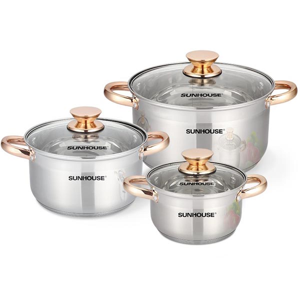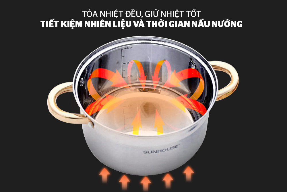 Với ưu điểm của chất liệu inox cao cấp là không bị oxy hoá, nồi có độ bền vượt trội, không han gỉ, không bị oxy hóa nên rất an toàn cho sức khoẻ. Bạn hoàn toàn yên tâm sử dụng nồi SUNHOUSE lâu dài để chế biến thật nhiều món ăn ngon cho gia đình.