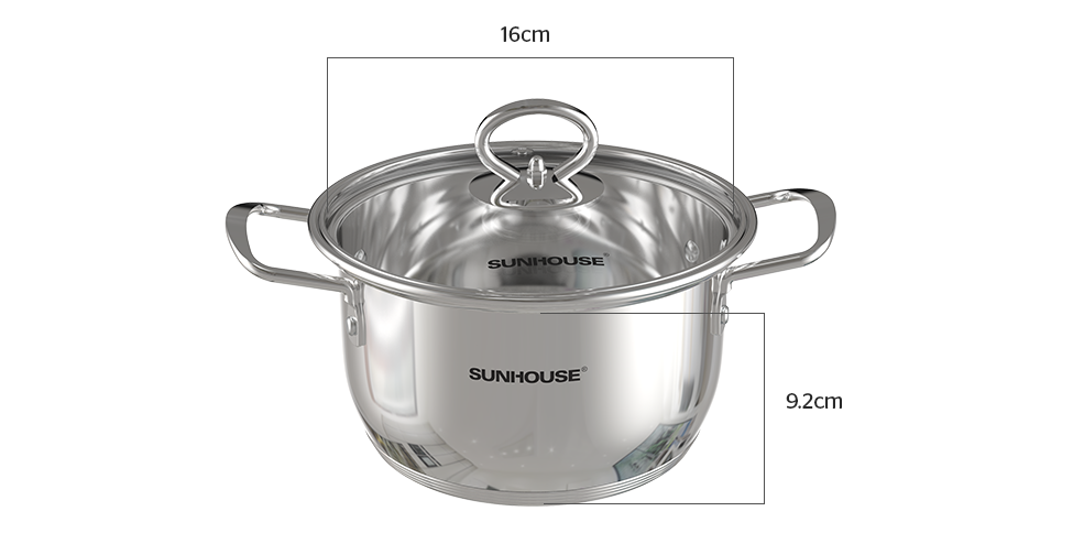 Nồi inox 5 đáy SUNHOUSE SHG788-16 sử dụng được với mọi loại bếp, kể cả bếp từ. Kích thước 16 cm thích hợp để luộc trứng, kho thịt và nấu lượng thức ăn nhỏ dành cho 1 – 2 người.