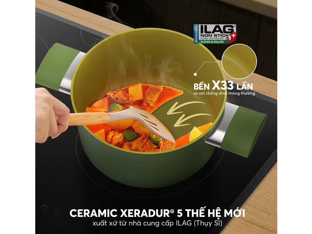 Với lớp chống dính Ceramic XERADUR 5 từ ILAG, Thụy Sĩ, nồi nhôm Elmich Olive EL-5523OV18 hoàn toàn không chứa PFAS và PTFE, đảm bảo an toàn cho sức khỏe và thân thiện với môi trường. Lớp chống dính này không chỉ bền bỉ mà còn chống mài mòn xuất sắc, chịu tới 101.000 lần chà rửa mà không sợ bong tróc, đảm bảo độ bền vượt trội gấp 33 lần so với các loại chống dính thông thường.