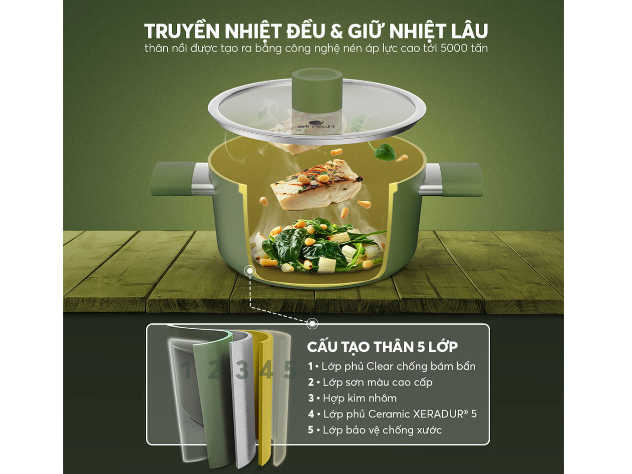 Thân nồi nhôm Elmich Olive được sản xuất theo công nghệ nén áp lực cao từ Châu Âu, giúp truyền nhiệt nhanh và đều, giữ nhiệt tốt, hạn chế tình trạng nóng cục bộ và cháy sém thức ăn. Món ăn nhờ vậy chín đều, giữ nguyên hương vị tự nhiên và các vitamin, khoáng chất cần thiết.