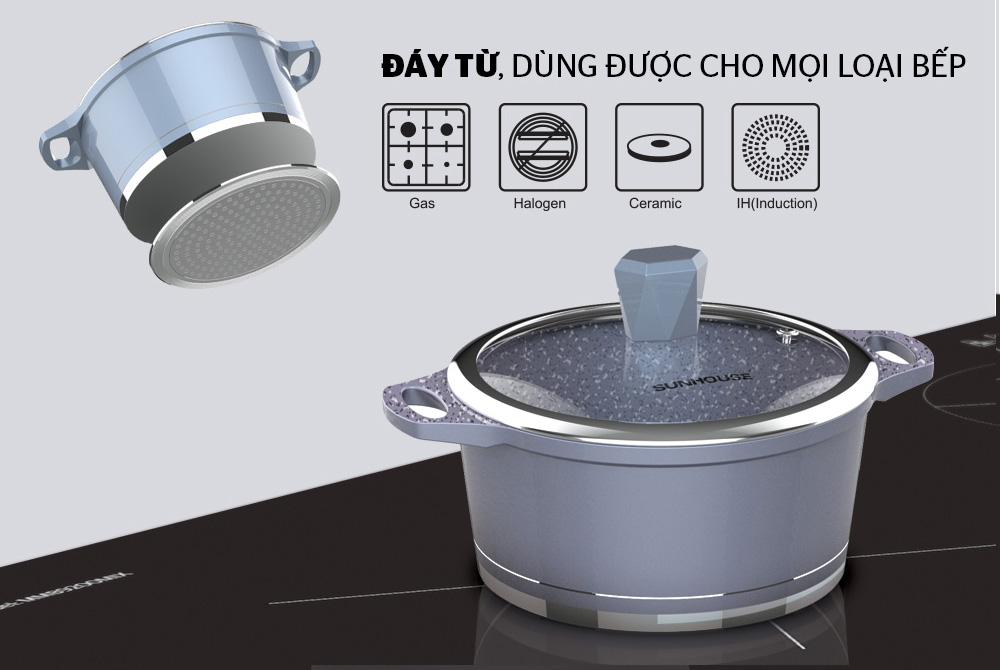 Sử dụng được trên mọi loại bếp: Nồi được cấu tạo đáy từ nên sử dụng được trên mọi loại bếp: bếp từ, bếp gas, bếp hồng ngoại.