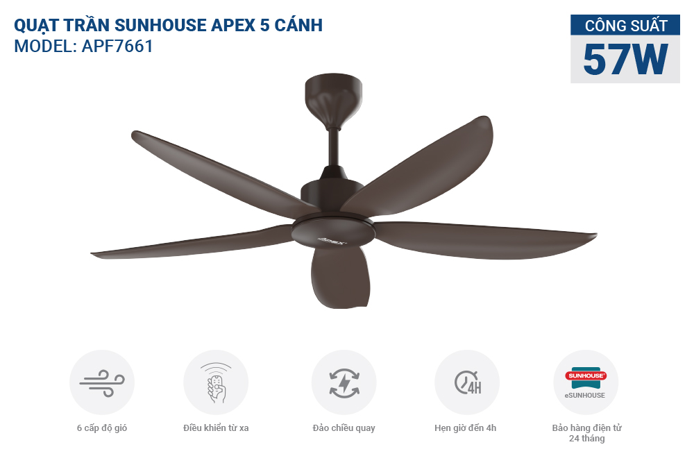Với điều khiển từ xa tích hợp, quạt trần SUNHOUSE APEX 5 cánh APF7661 mang đến sự tiện lợi vượt trội trong từng thao tác. Người dùng có thể dễ dàng điều chỉnh chế độ quay, tốc độ gió (1-6 cấp độ), và sử dụng tính năng hẹn giờ tắt linh hoạt (1, 2 hoặc 4 giờ).