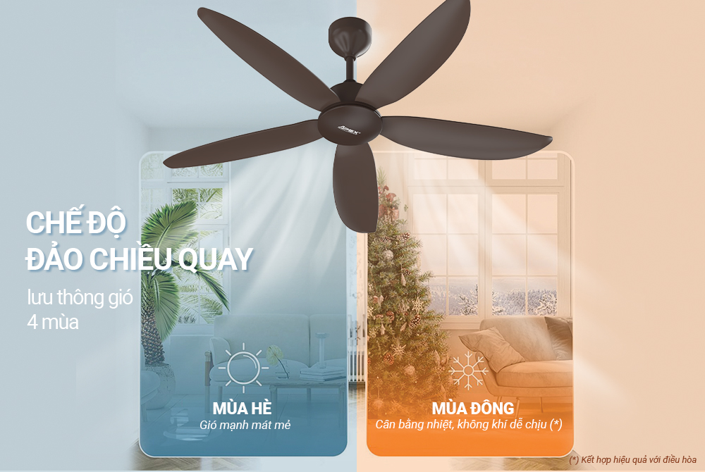 Đặc biệt, chế độ đảo chiều quay còn mang đến sự thoải mái vượt trội khi luân chuyển không khí xung quanh phòng, tránh hiện tượng gió tập trung vào một vùng gây khó chịu hoặc ảnh hưởng sức khỏe. Tính năng này phù hợp cho gia đình có trẻ nhỏ, người lớn tuổi, và tối ưu hiệu quả khi sử dụng kết hợp với điều hòa, đảm bảo tiết kiệm năng lượng mà vẫn duy trì không gian thoáng mát hoặc ấm áp suốt cả năm.