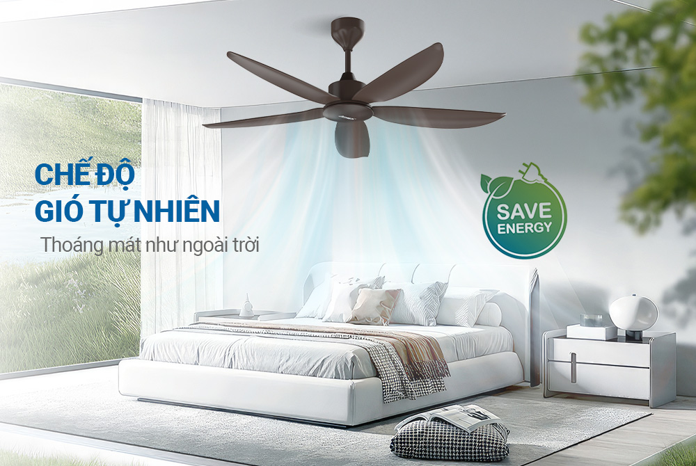 Quạt trần SUNHOUSE APEX 5 cánh APF7661 được trang bị chế độ gió tự nhiên thông minh, tự động điều chỉnh tốc độ quay để mô phỏng luồng gió tự nhiên. Chế độ này không chỉ mang lại cảm giác thoáng đãng, dễ chịu như gió trời mà còn giúp tiết kiệm điện năng, vì quạt không cần hoạt động liên tục ở tốc độ cao. Đây là giải pháp hoàn hảo cho không gian sống, vừa tiết kiệm năng lượng, vừa đảm bảo sự thoải mái tối đa.