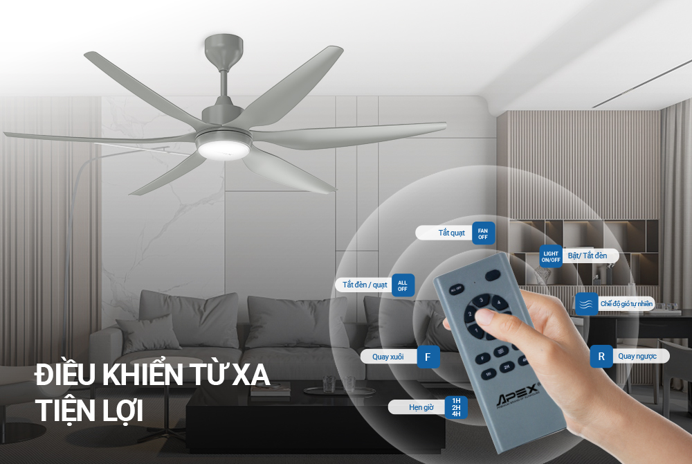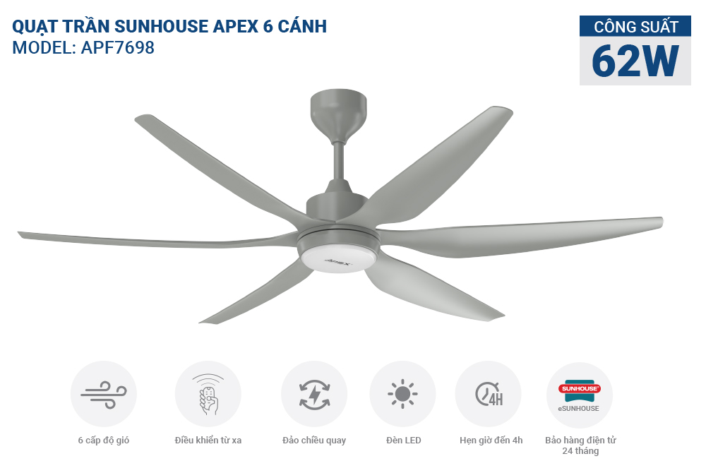 Quạt trần SUNHOUSE APEX 6 cánh APF7698 đi kèm điều khiển từ xa tiện lợi, cho phép người dùng dễ dàng thay đổi chế độ quay, điều chỉnh tốc độ gió (1-6 cấp độ), lựa chọn ánh sáng LED phù hợp và cài đặt hẹn giờ tắt (1, 2 hoặc 4 giờ). Sự linh hoạt này giúp tối ưu hóa trải nghiệm sử dụng và đáp ứng mọi nhu cầu trong không gian sống hiện đại.