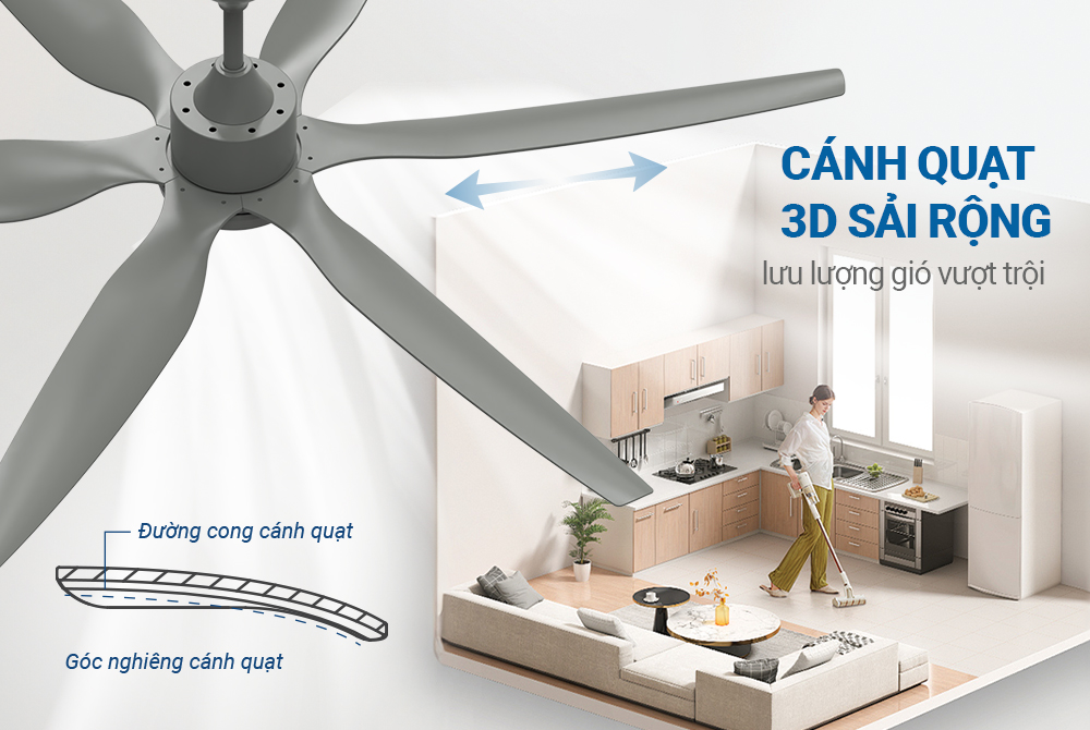 - Cánh quạt 3D sải rộng, lưu lượng gió vượt trội, gió mát diện rộng