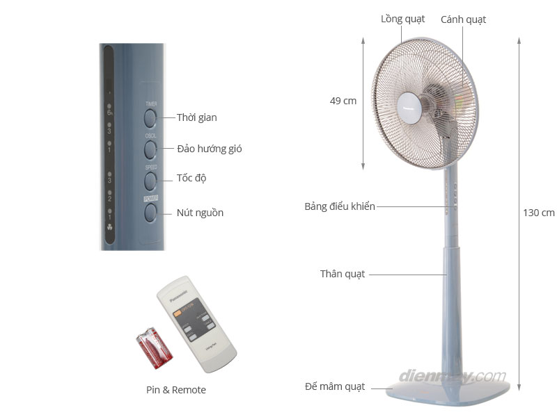 - Quạt vừa có bảng điều khiển nút nhấn dễ dàng sử dụng, lại trang bị cả điều khiển từ xa rất tiện dụng, người dùng có thể điều chỉnh tốc độ gió, hướng quay của quạt từ xa mà không cần phải tới gần quạt.