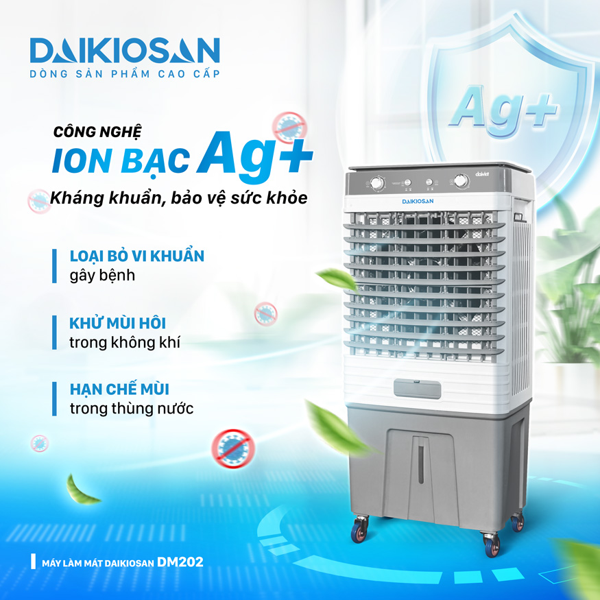 Quạt điều hòa không khí Daikiosan DM202 được trang bị công nghệ diệt khuẩn Ag+ tiên tiến, có khả năng tiêu diệt đồng thời nhiều loại vi sinh vật và vi khuẩn gây bệnh độc hại. Đảm bảo rằng bạn luôn được bảo vệ khỏi các tác nhân gây hại trong không khí và hạn chế mùi khó chịu trong khi sử dụng. Đây là ứng dụng lần đầu tiên và duy nhất có ở quạt điều hoà được Daikiosan ứng dụng vào quạt điều hoà.