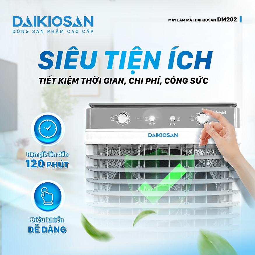 Quạt điều hòa thương mại Daikiosan DM202 có thiết kế hiện đại, nhỏ gọn, và tiết kiệm diện tích, với thân máy làm bằng nhựa nguyên sinh giúp ngoại hình luôn sáng bóng và dễ dàng vệ sinh.