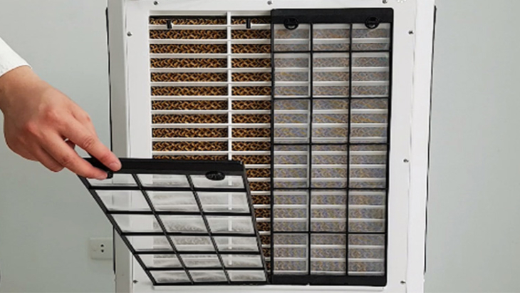 Tấm lưới chắn bụi được bố trí ở hai bên hông và mặt sau của quạt, gắn bên ngoài tấm làm mát cooling pad, có chức năng lọc bụi bẩn trong không khí trước khi đi vào tấm làm mát.
