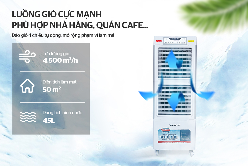 Sản phẩm cho lưu lượng gió lên đến 4.500m3/giờ, kết hợp chức năng đảo gió tự động 4 chiều, cho phép mở rộng phạm vi làm mát lên đến 50m2. Những diện tích phù hợp sử dụng sản phẩm là nhà hàng, quán ăn, quán café…
