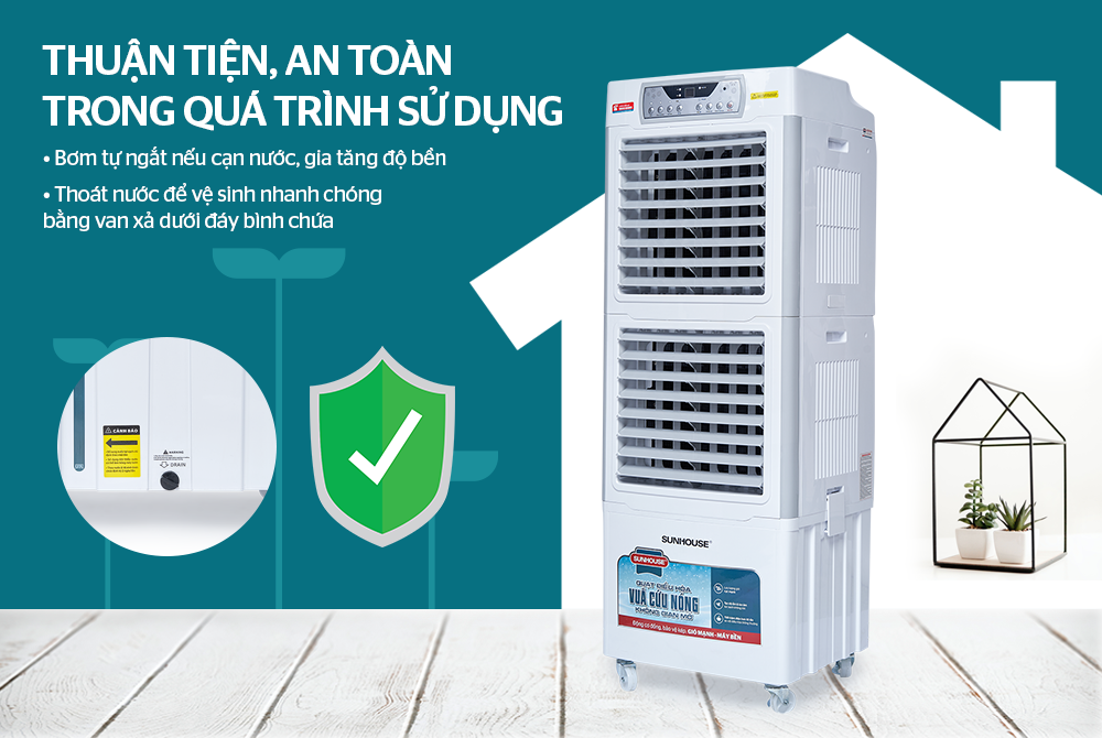 - Thiết kế trang nhã, bền đẹp: Máy làm mát không khí SUNHOUSE SHD7756 có động cơ làm bằng đồng nguyên chất siêu bền, hoạt động ổn định. Thân máy làm bằng nhựa cao cấp bền đẹp, màu sắc trang nhã và sử dụng tốt ở không gian lên đến 50m2 như cửa hàng, quán cafe, nhà xưởng,...