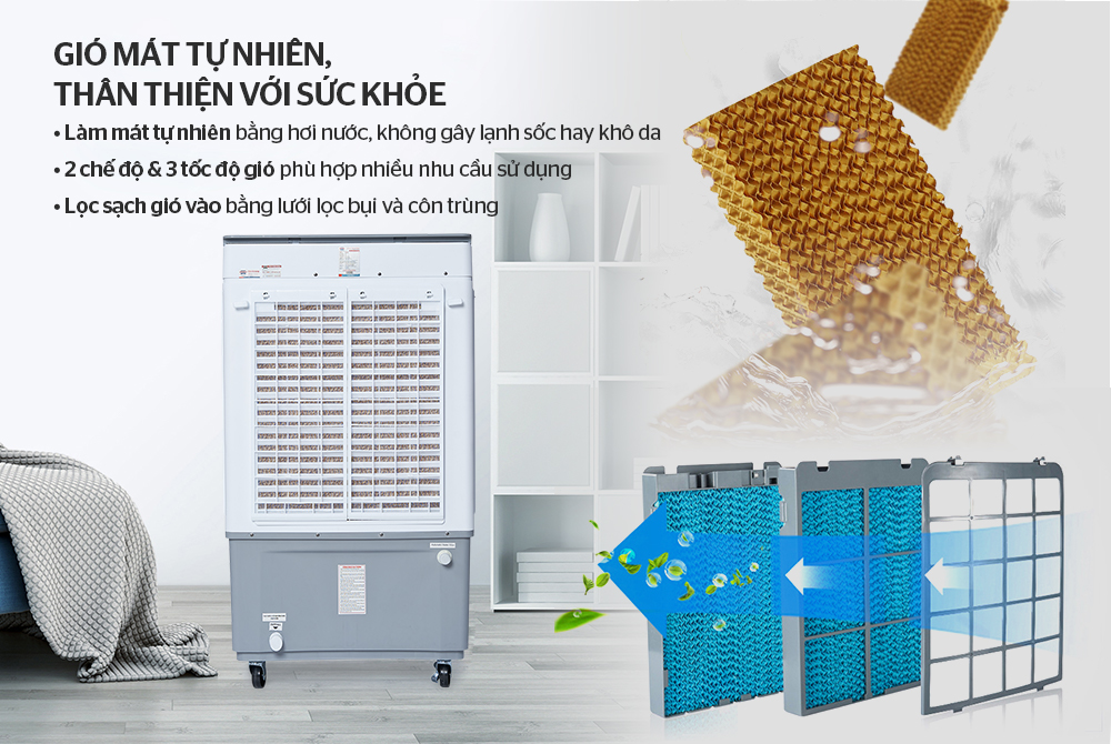 Luồng không khí cũng được lọc sạch qua 2 lớp: lưới lọc bụi bên ngoài và tấm làm mát phía trong. Cơ chế là lưới lọc bụi sẽ giữ lại các bụi lớn và tấm làm mát khi đang ướt nước sẽ giữ lại các hạt bụi cỡ nhỏ hơn (vì thế nên bạn phải thường xuyên vệ sinh 2 bộ phận này).