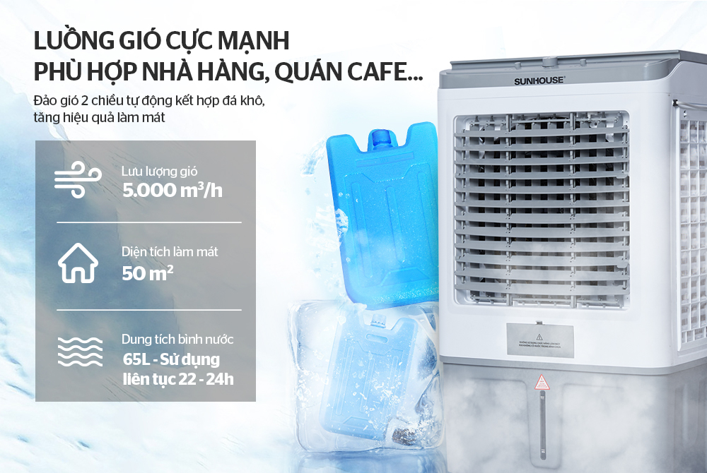 Đặc biệt sản phẩm máy làm mát không khí SUNHOUSE SHD7757 làm mát hiệu quả với không gian mở như quán cafe, cửa hàng, nhà hàng, nhà xưởng..những nơi mà quạt mát thông thường hay điều hòa không thể phát huy hiệu quả làm mát.